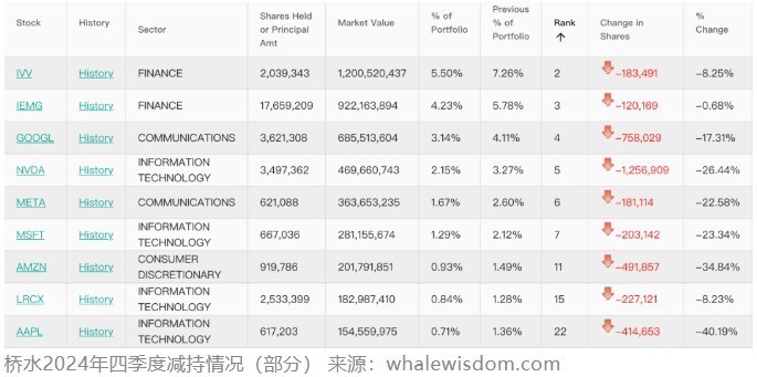 在减持方面,桥水基金于2024年四季度减持了125.7万股英伟达、75.8万股谷歌A、18.1万股META、20.3万股微软、49.2万股亚马逊、41.5万股苹果。其中,对苹果减仓幅度达到40%,对英伟达的减仓幅度达到26%,对亚马逊的减仓幅度接近35%。