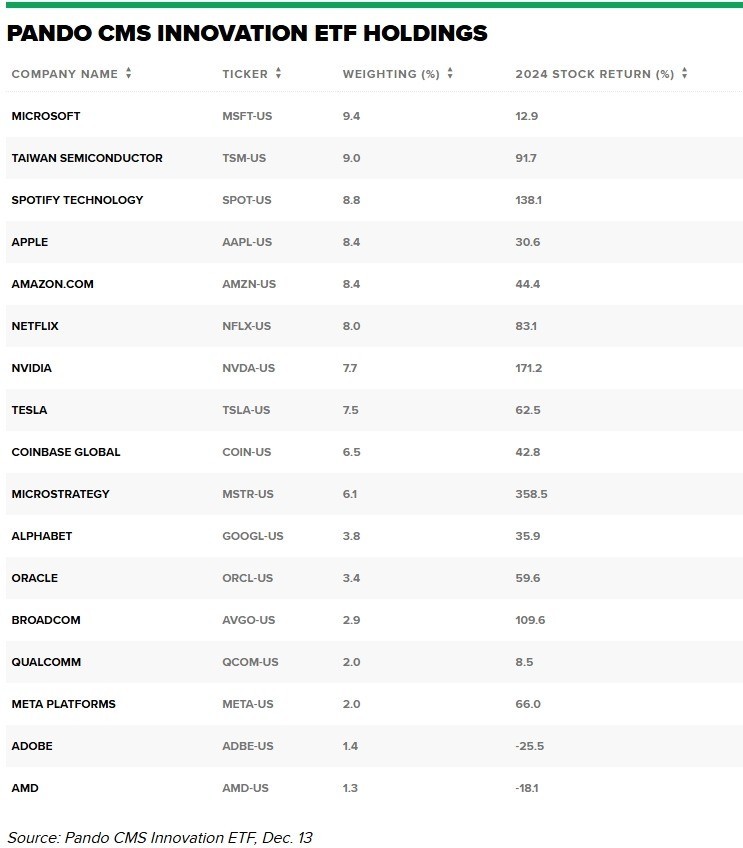 该ETF持有高度集中的17只股票,包括微软、芯片制造商台积电、Spotify、苹果、亚马逊、奈飞、英伟达和特斯拉等,这使其成为全球表现最好的主动管理ETF之一。这17只股票在2024年的平均回报率为75%(未加权计算)。